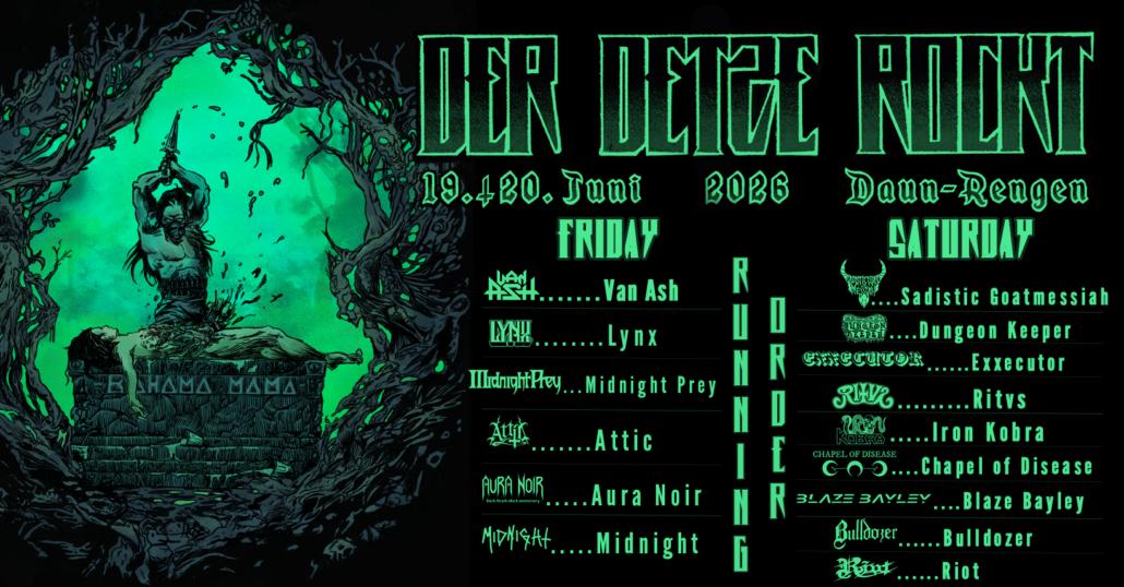 Sadistic Goatmessiah, Dungeon Keeper, Exxecutor, Ritvs, Iron Kobra, Chapel of Disease, Blaze Bayley, Bulldozer, Riot